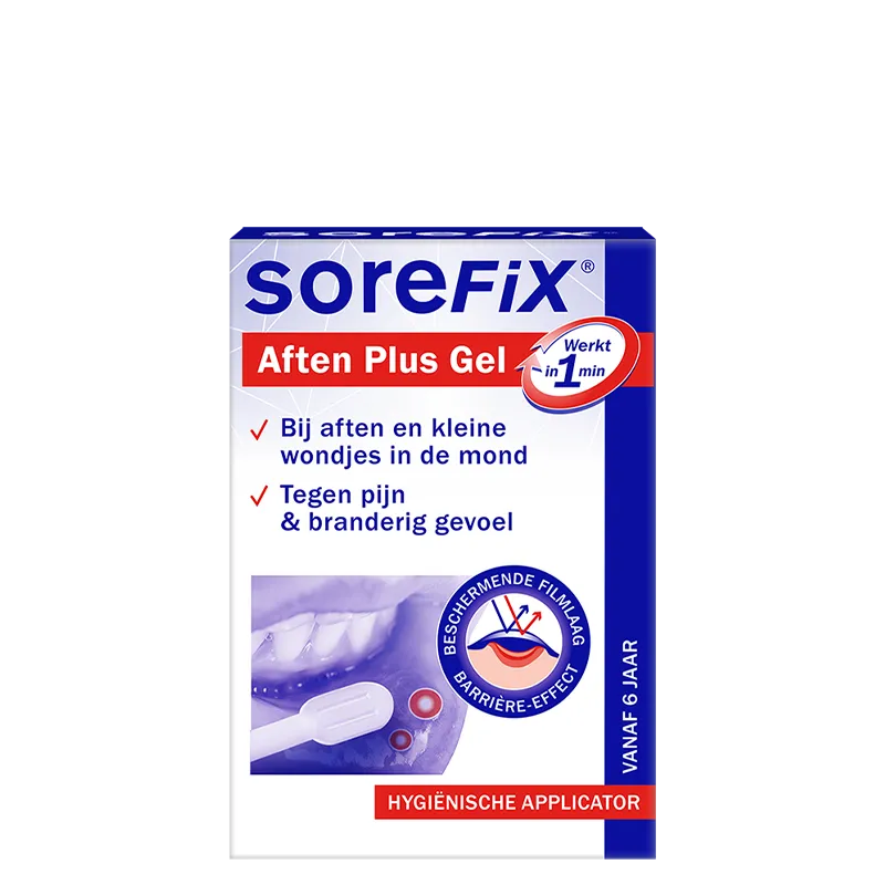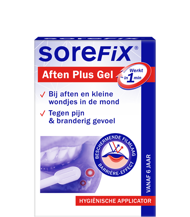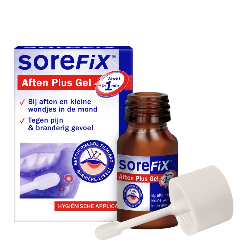Bijna 1 op de 5 volwassenen heeft regelmatig last van aften. Aften zijn kleine, pijnlijke zweertjes in het mondslijmvlies en kunnen overal in de mond voorkomen, zoals op het tandvlees of aan de binnenkant van de wang of lip. Ze veroorzaken vaak veel pijn, vooral tijdens eten en drinken. SoreFix Aften Plus Gel biedt een complete behandeling voor aften en kleine wondjes in de mond.